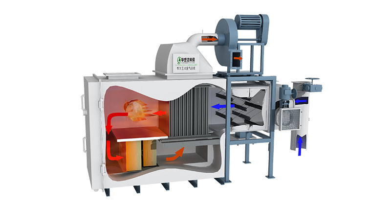VOCs流向二: 高濃度的VOCs氣體在脫附風(fēng)機(jī)的帶動(dòng)下進(jìn)入2級(jí)換熱器冷側(cè)流道進(jìn)行熱量交換,氣體溫度由120℃升高至300℃后進(jìn)入催化燃燒室,催化燃燒室中的溫度表對(duì)進(jìn)入后的VOCs氣體溫度進(jìn)行確認(rèn),若的VOCs氣體溫度低于300℃,則催化燃燒室中的燃燒器自動(dòng)點(diǎn)火,對(duì)未達(dá)到設(shè)定溫度的VOCs氣體進(jìn)行二次加熱,使之溫度處于300℃至350℃之間。VOCs氣體流經(jīng)燃燒器后流經(jīng)催化劑表面發(fā)生無(wú)焰燃燒。VOCs氣體中的有機(jī)分子氧化分解為 CO2 和 H2O,同時(shí)放出大量熱能。VOCs比熱大約為25℃/g,當(dāng)VOCs濃度為10g/m3時(shí),溫升為250℃。所以,300℃的VOCs氣體經(jīng)過(guò)催化燃燒后溫度升高至550℃。經(jīng)過(guò)催化燃燒后的VOCs氣體被氧化分解為潔凈的高溫氣體,流經(jīng)1級(jí)換熱器熱側(cè)流道及2級(jí)換熱器熱側(cè)流道給它們提供冷側(cè)流道換熱用的熱能后經(jīng)過(guò)煙囪排放到大氣中。后期的余熱回收利用設(shè)計(jì)方案也會(huì)將此份即高溫又潔凈的氣體回收利用,為甲方生產(chǎn)車(chē)間提供熱能,用于甲方的熱水供應(yīng)及環(huán)境供暖等。